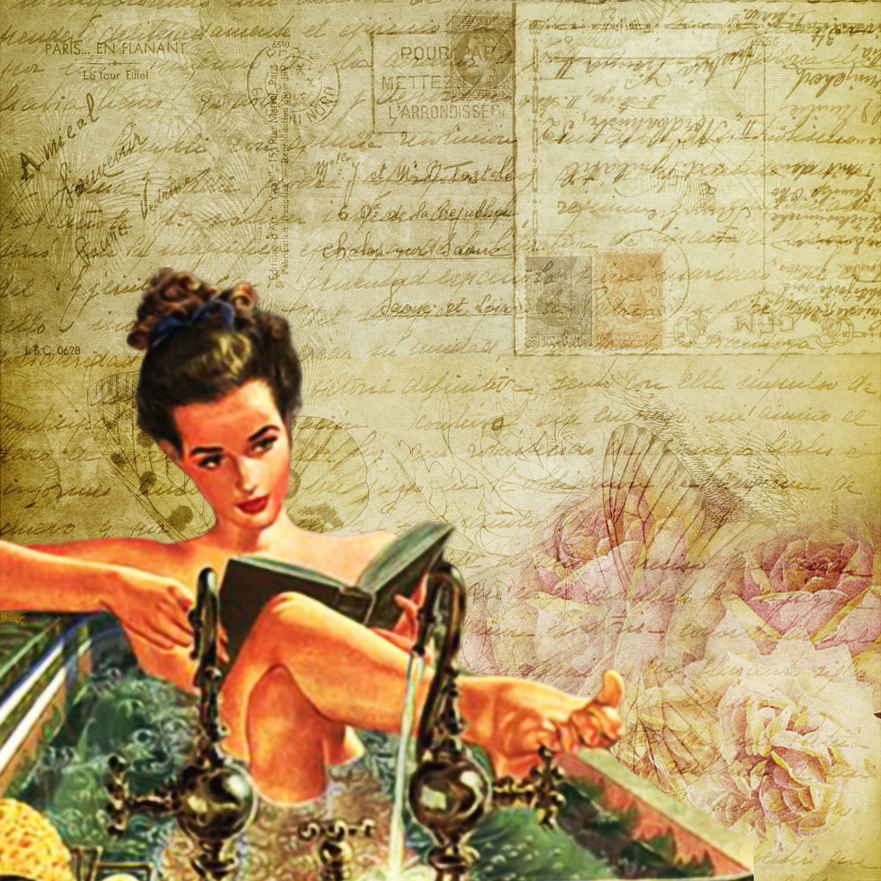 Vintage Print - Vintage Art Print - Beautiful Girl in the Bath Reading Love Letters - Printable